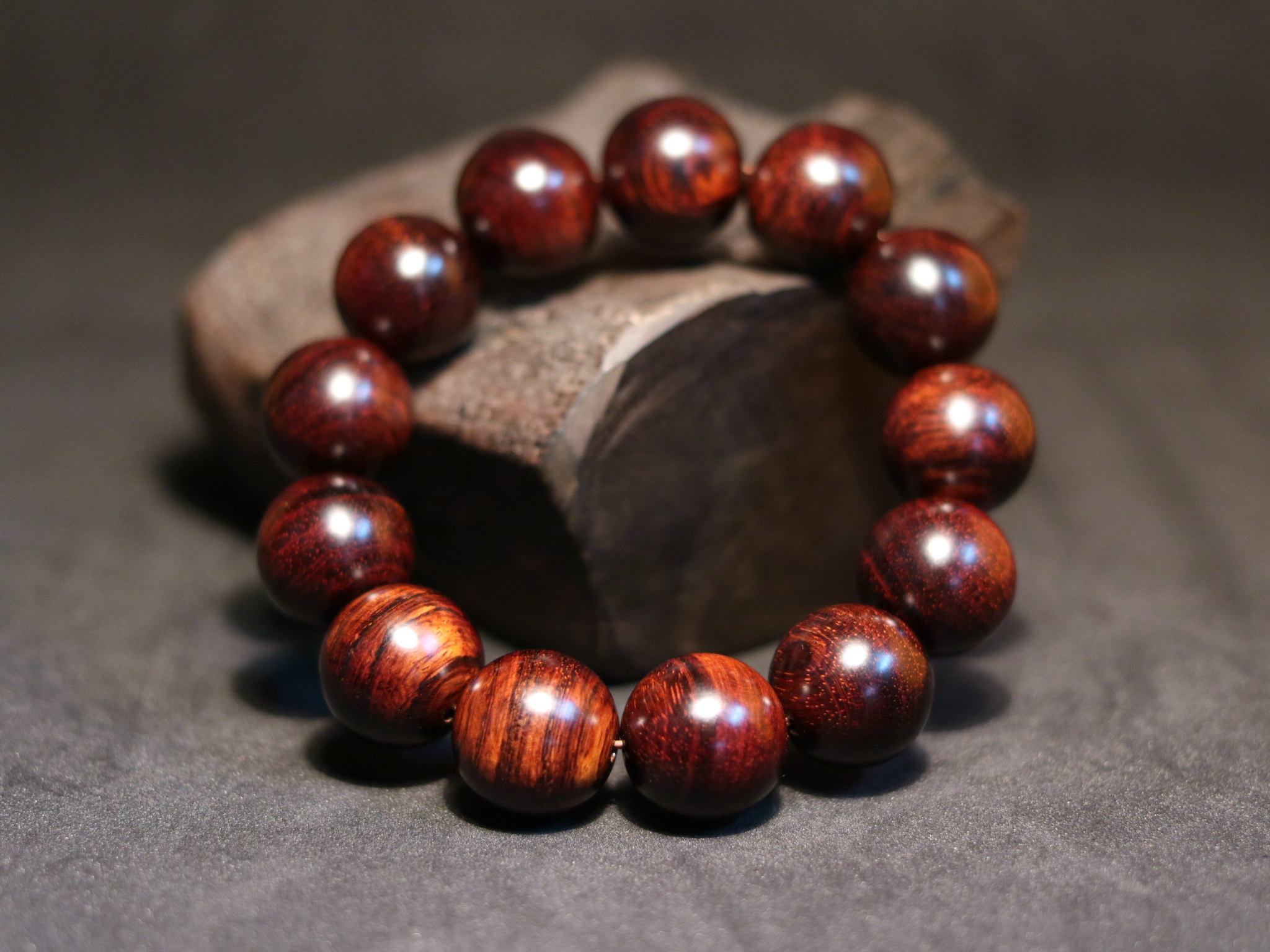 Kích thước: Vòng tay gỗ Tử Đàn có size 18 ly, tổng cộng có 13 hạt được xâu chuỗi thành vòng, mỗi hạt có kích thước là 18mm.